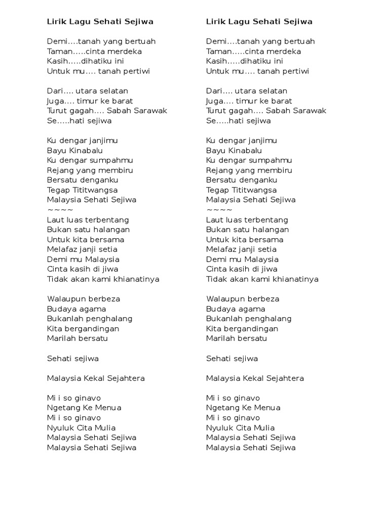 Chorus Walaupunberbeza BudayaAgama Bukanlahpenghalang Kitabergandingan Marilahbersatu Sehati sejiwa MalaysiaKekal SejahteraKorusIban Kadazan Mi i so ginavo kadazan Kitai DekakMujur iban mi i so ginavokadazan NgetanKe Menua iban Mi i soginavo kadazan NyulukCitaMulia iban MalaysiaSehati Sejiwa. Lirik Lagu Seandainya Kita Sehati Sejiwa AXLs. Lagu ini dinyanyikan oleh Alif Satar choir penyanyi latar.